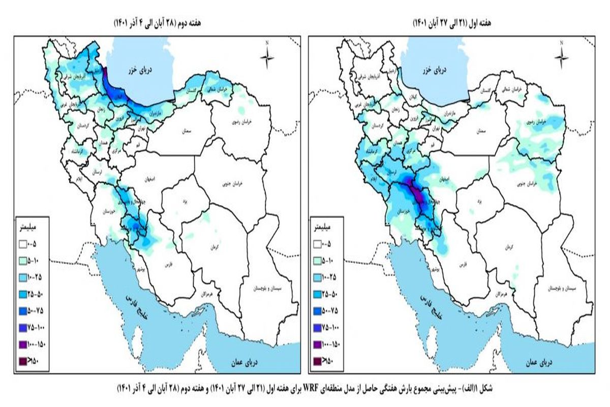 هفته منتهی به ۴ آذرماه حوضه آبریز خلیجفارس و دریای عمان بیشینه بارش ۶۷.۶ میلیمتری با متوسط محدوده ۳.۸ میلیمتری را تجربه خواهد کرد.