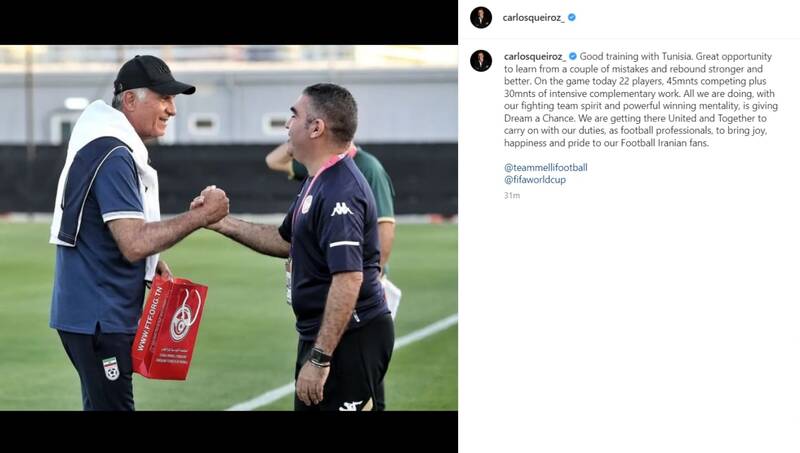 در پست کیروش آمده است: «تمرین خوب با تونس. فرصت عالی برای درس گرفتن از چند اشتباه و بازگشت قویتر و بهتر. در بازی امروز ۲۲ بازیکن، به ۴۵ دقیقه فرصت رقابت و ۳۰ دقیقه انجام کار فشرده مکمل دست پیدا کردند. تنها کاری که ما با روحیه تیمی جنگنده و ذهنیت قدرتمندِ پیروزی انجام میدهیم، دادن یک شانس به رویا است. ما متحد و با یکدیگر به آنجا میرسیم اگر به وظایف خود به عنوان یک حرفهای به فوتبال ادامه دهیم و به این ترتیب برای هواداران فوتبال ایران شادی و سربلندی به ارمغان بیاوریم.»