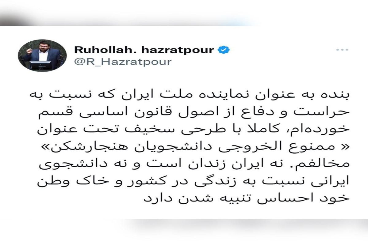 روح الله حضرت پور با انتشار توییتی مخالفت خود را با طرح ممنوعیت خروج دانشجویان معترض اعلام کرد.