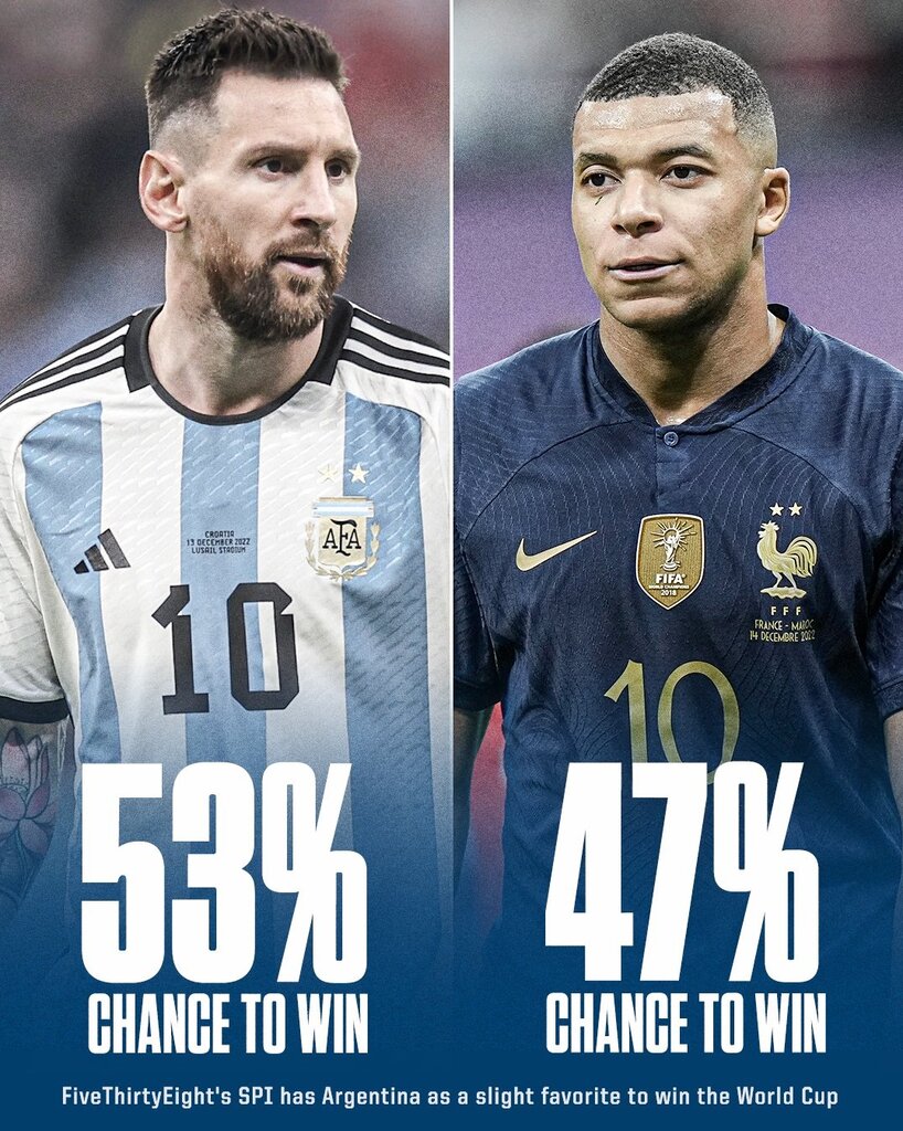 طبق نظرسنجیها لیونل مسی با آرژانتین ۵۳ درصد شانش قهرمانی در جام جهانی ۲۰۲۲ را دارد و در مقابل کیلیان امباپه به همراه تیم ملی فرانسه ۴۷ درصد شانش قهرمانی را دارد.