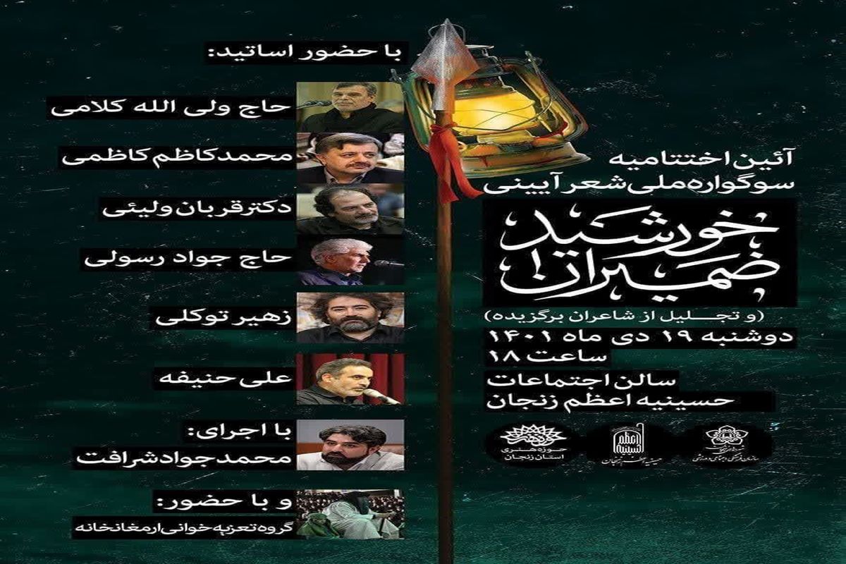 به گزارش خبرگزاری برنا از استان زنجان؛ آیین اختتامیه نخستین سوگواره ملی شعر آیینی «خورشید ضمیران» 19 دی ماه 1401 در سالن اجتماعات حسینیه اعظم زنجان برگزار و برگزیدگان این سوگواره معرفی و تجلیل خواهد شد.