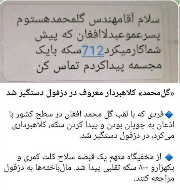 به گزارش مشرق، نصرت اله گراوند گفت: در پی افزایش کلاهبرداری از طریق ارسال پیامک از طریق تلفن همراه و مراجعه چند نفر شاکی از نقاط مختلف کشور به پلیس آگاهی مبنی ارسال پیامک و فروش سکههای تقلبی با قسمهای دروغین مبنی بر پیدا کردن سکههای عتیقه در گاوداری و کلاهبرداری ۱۰ میلیارد ریالی، توسط یک نفر که با لهجه افغانی و به نام «گل محمد» و «لطیف» افغان کلاهبرداری شده است پلیس آگاهی دستگیری متهم کلاهبردار را در دستور کار خود قرار داد.