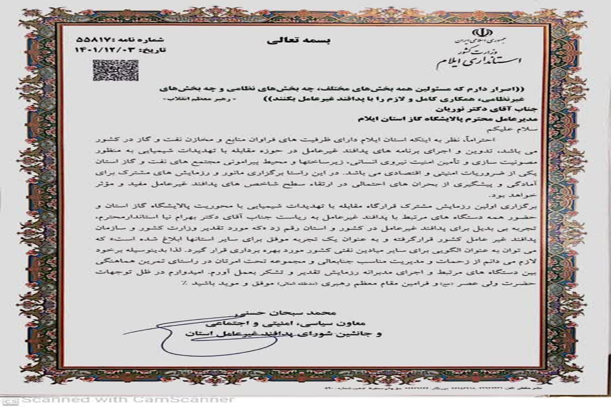 گفتنی است که رزمایش مشترک شرکتهای نفت و گاز با محوریت پالایشگاه گاز ایلام در دی ماه سال جاری و حضور شرکت های گاز استان ایلام، نفت و گاز غرب کشور، پتروشیمی ایلام، پخش فراورده های نفتی منطقه ایلام، شورای تامین استان، مدیریت بحران و پدافند غیر عامل استانداری ایلام برگزار شد که با امتیاز خیلی خوبی نظر داوران ارزیاب را به سوی خود جلب کرد.