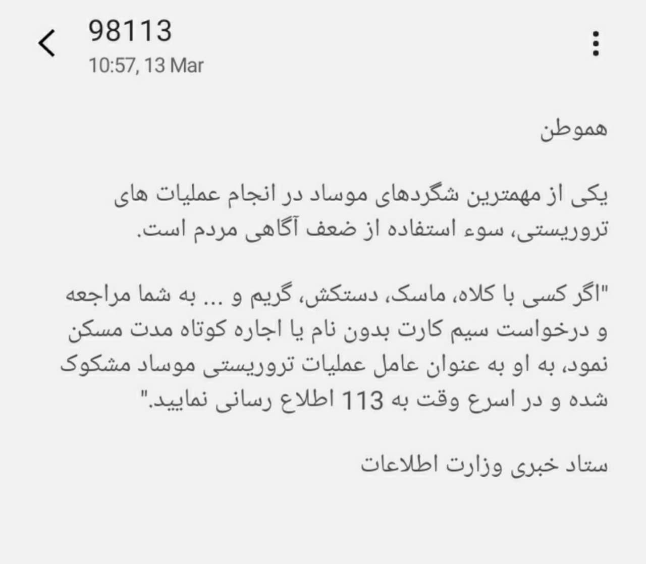 ستاد خبری وزارت اطلاعات در پیامکی به مردم در مورد شگرد جدید موساد هشدار داد.