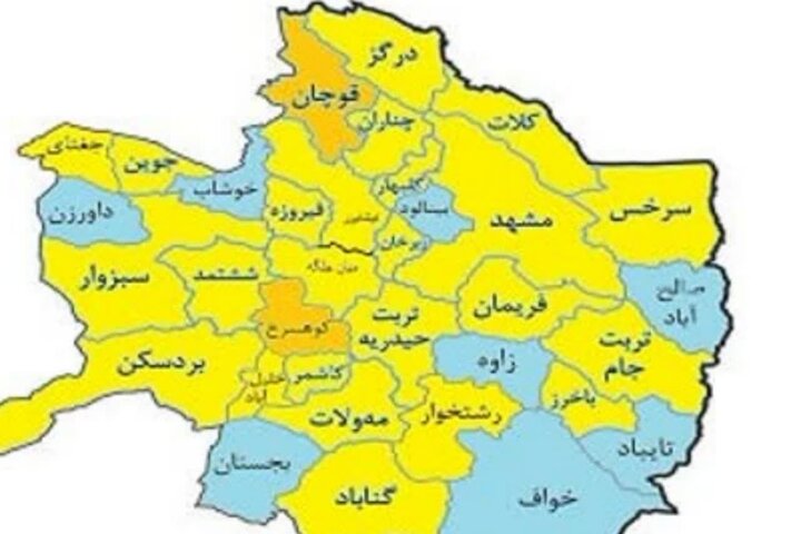 به گزارش خبرگزاری مهر، محمد پهلوان کاشی با بیان اینکه شمار شهرهای با وضعیت زرد کرونایی از ۲۲ به ۲۴ شهرستان افزایش یافته است، اظهار کرد: هم اینک مشهد و ۲۳ شهرستان دیگر استان شامل شهرستانهای باخرز، بردسکن، تربت جام، تربت حیدریه، جغتای، جوین، چناران، گلبهار، خلیل آباد، درگز، رشتخوار، سبزوار، ششتمد، سرخس، فریمان، فیروزه، کاشمر، کلات، گناباد، مه ولات، نیشابور، میان جلگه، زبرخان، در وضعیت زرد کرونایی قرار دارند.
