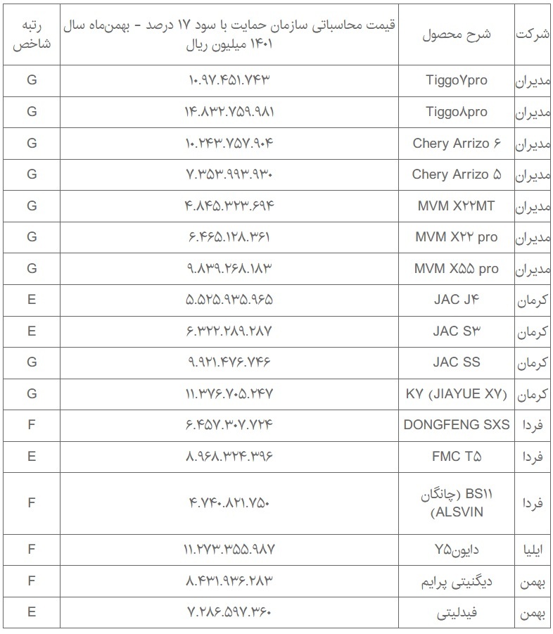 قیمت نهایی ۱۷ خودروی مونتاژی با احتساب سود ۱۷ درصد اعلام شد. قیمتهای محاسباتی سازمان حمایت مصرف کنندگان و تولید کنندگان بر اساس آخرین صورت مالی شرکتها مربوط به سال ۱۴۰۰ بوده و تعدیلات لازم همچون تغییر نرخ دستمزد و غیره برای سال ۱۴۰۱ تا تاریخ مصوبه ۱۱ بهمن ۱۴۰۱ شورای رقابت و بر اساس مستندات ارائه شده توسط شرکتهای خودروساز بوده است.