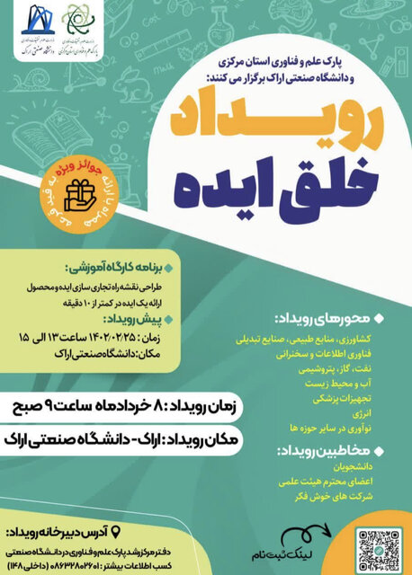 وی با بیان اینکه مخاطبان این رویداد، تمامی دانشجویان، اعضای هیئت علمی دانشگاهها و شرکتهای نوآور و فناور هستند گفت: تاریخ برگزاری این رویداد هشتم خردادماه ساعت ۹ صبح در محل دانشگاه صنعتی اراک است.