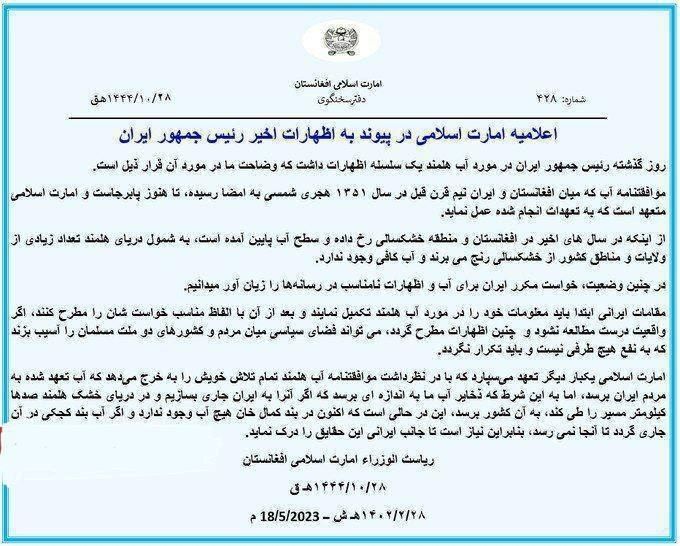 به گزارش شمال نیوز، امارت اسلامی افغانستان در پاسخ به اظهارات رئیسجمهور کشورمان درباره حقابه هیزمند اطلاعیهای صادر کرد و ضمن توجیه در خصوص عدم اجرای توافقنامه سال ۵۱، از مسئولان ایرانی خواست اظهارات پیگیرانه خود را تکرار نکنند.