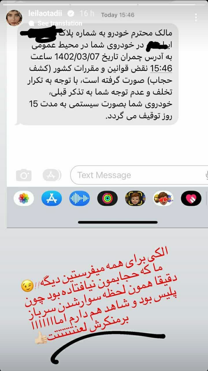 برای لیلا اوتادی پیامک کشف حجاب از طرف فراجا ارسال شده و خودروی او به صورت سیستمی توقیف شده است.