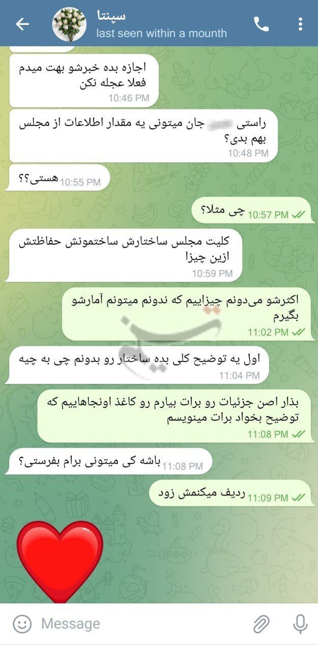 وی که هماکنون در بازداشت دستگاههای امنیتی قرار دارد، در اعترافاتش، به سؤالات سرپل منافقین در خصوص نقشه ساختمانهای مجلس، راههای ورود و خروج و تعداد محافظین هر درب اشاره کرده و گفته میشود که بر اساس اسناد و اطلاعات بهدستآمده، نقشه کامل مجلس شورای اسلامی را در اختیار سرپل منافقین قرار داده است.