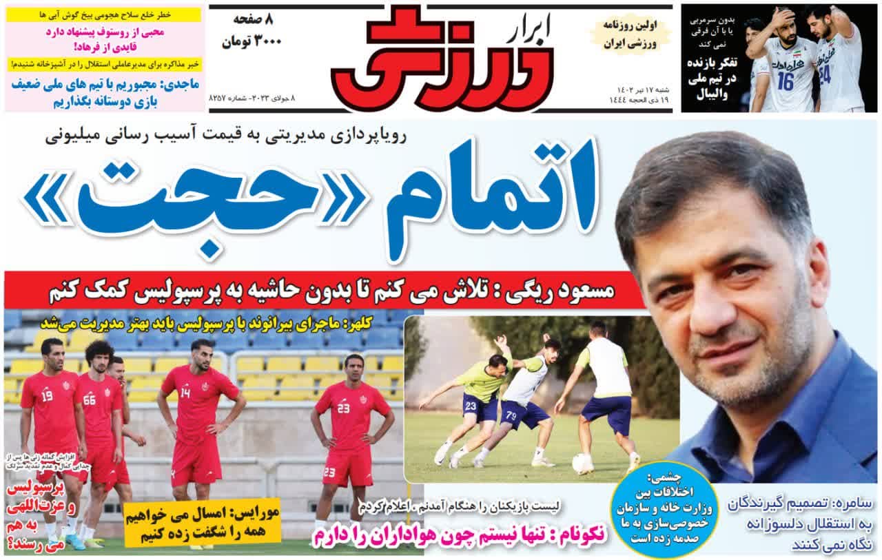 صفحه نخست «ابرار ورزشی» امروز (شنبه ۱۷ تير ۱۴۰۲) را در ادامه مشاهده میکنید.