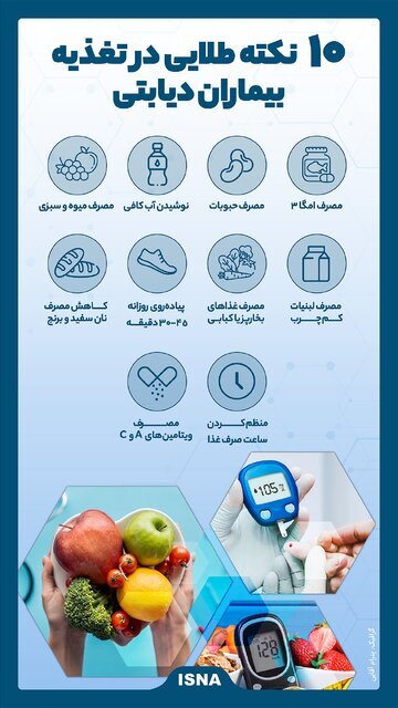 به گفتۀ رییس گروه تغذیه و دارویی معاونت بهداشت، «رژیم غذایی هر بیمار در مرحله دیابت یا پیش دیابت با توجه به شرایط وی و بیماریهای همراهش تعیین میشود، در این شرایط بهتر است بیماران دیابتی برای دریافت برنامه غذایی و مشاوره تغذیه به مراکز خدمات جامع سلامت مراجعه کنند.» در این اینفوگرافیک ۱۰ نکته طلایی در تعذیه بیماران دیابتی را به توصیۀ فرشته فزونی مشاهده میکنید./ ایسنا