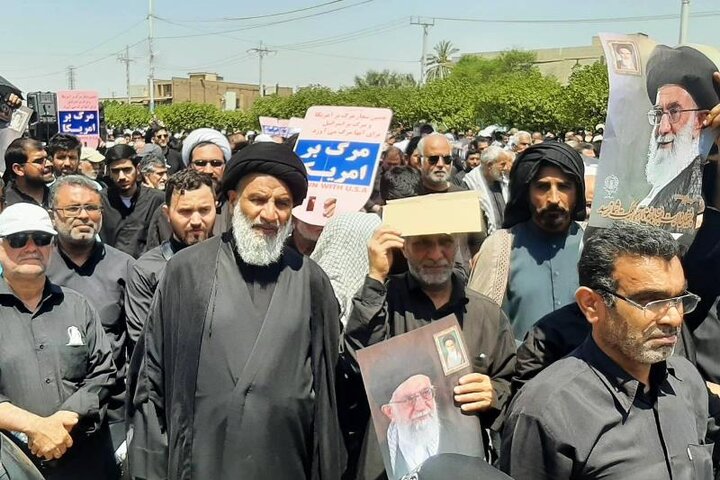 گرمای این موقع از روز در اهواز بیش از ۵۰ درجه است ولی مردم در دفاع از کتاب مقدس مسلمانان حضوری پرشور در راهپیمایی امروز داشتند.