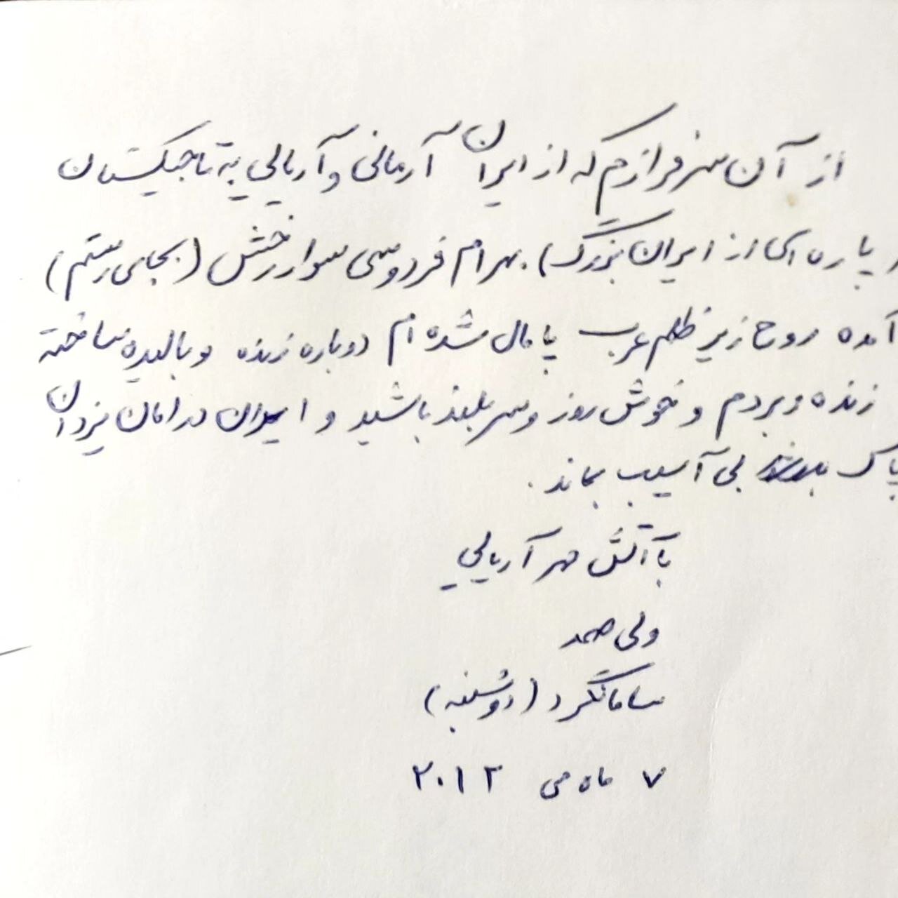 در نوشته اهدایی کتاب به من، مرا با بهرام شاهنامه خطاب کرده و از رستم و رخش یاد کده و احساس عمیق خود را نسبت به ایران و ایرانی بیان داشته است که ملاحظه می فرمایید