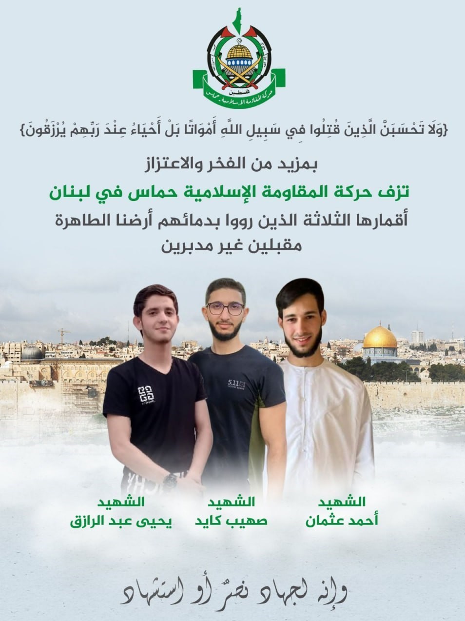 گردانهای القسام- لبنان- از شهادت سه تن از رزمندگانش در انفجار دیوارمرزی و نفوذ به داخل شمال سرزمین های اشغالی و درگیری برای دومین روز پیایی با صهیونیستها خبر داد.