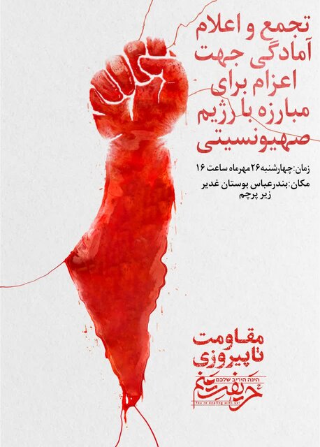 تجمع و اعلام انزجار خودجوش مردمی از جنایات ننگین صهیونیستها و اعلام آمادگی جهت اعزام برای مبارزه با رژیم صهیونیستی مردم بندرعباس ساعت ۱۶ امروز ۴شنبه ۲۶ مهرماه برگزار میشود.
