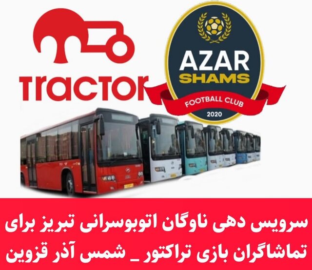 وی افزود: پیرو مسابقه فوتبال بین تیمهای تراکتور و شمس آذر قزوین در روز شنبه ۲۹ مهرماه، از هفته ششم رقابتهای لیگ برتر فوتبال کشور و ضرورت سرویس دهی به تماشاگران پرشور و فهیم، ناوگان شرکت واحد اتوبوسرانی تبریز و حومه جهت رفاه حال تماشاگران از ساعت ۱۶.۳۰ و از طریق مبادی میدان ستارخان (یکه دکان)، میدان جهاد(نصف راه) و چهارراه عباسی نسبت به انتقال تماشاگران به ورزشگاه یادگار امام (ره) اقدام خواهد کرد.