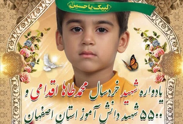 به گزارش خبرنگار مهر، همزمان با پنجمین سالروز شهادت شهید خردسال محمدطاها اقدامی یادواره این شهید و ۵۵۰۰ شهید دانش آموز استان اصفهان در روستای اذان شهرستان شاهین شهر و میمه برگزار میشود.