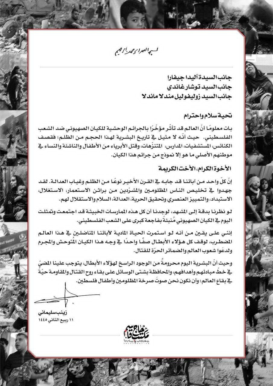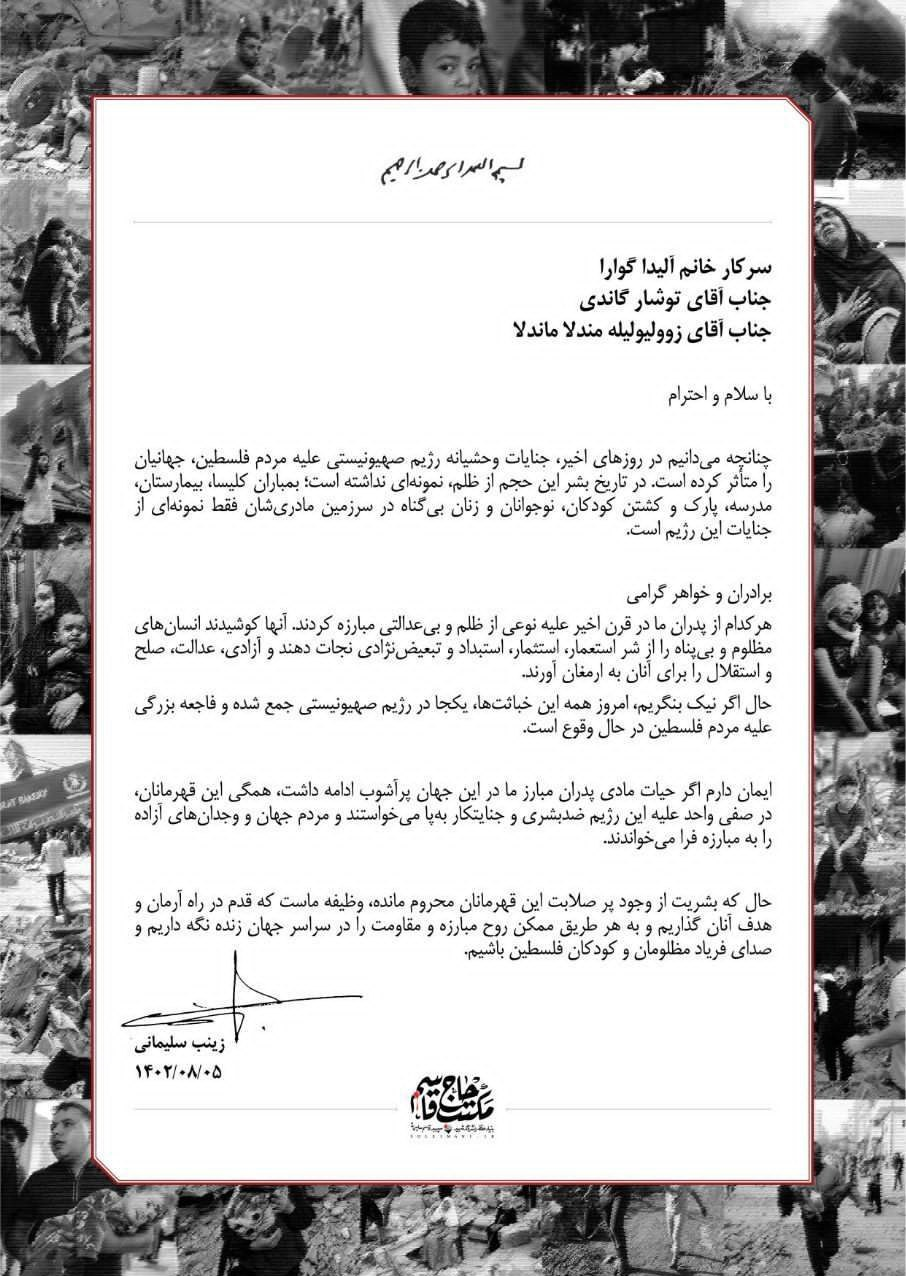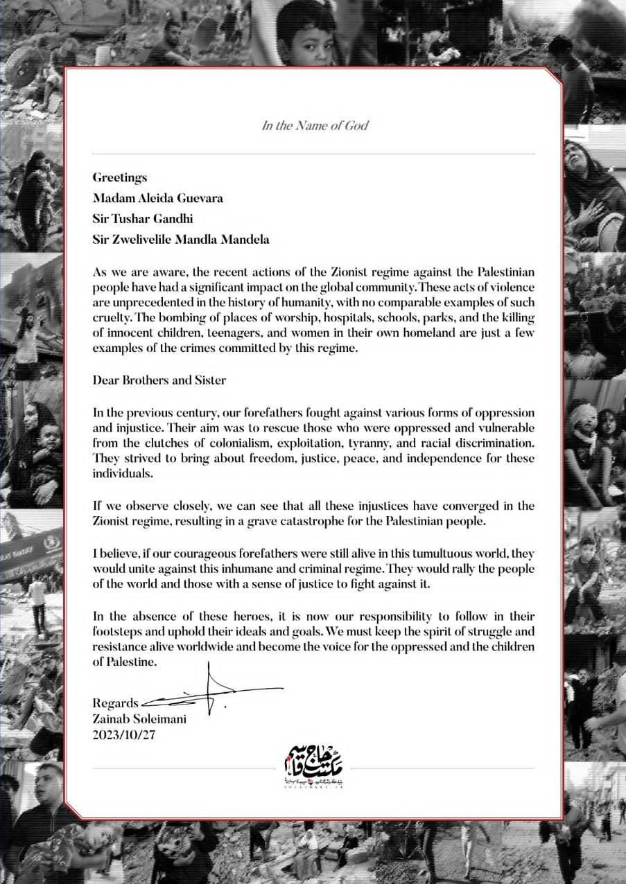 زینب سلیمانی فرزند سردار شهید حاج قاسم سلیمانی به نوادگان گاندی و ماندلا و دختر چهگوارا نامه نوشت و آنها را به حمایت از فلسطین دعوت کرد.