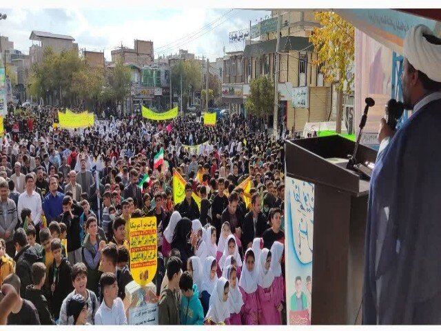 دهگلان_ مدیرکل تبلیغات اسلامی استان کردستان در راهپیمایی ۱۳ ابان شهر دهگلان سخنرانی کرد و سپس دانشآموزان با همراهی وی، شعار مرگ بر اسراییل سردادند.