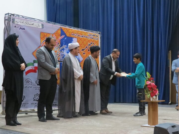 وی اسامی نفرات اول این مسابقات در بخش دختران و پسران را به ترتیب در گروه نور، زینب متولیان و محمد مهدی محمودی، گروه یاسین، صبا کارگر و محمد هادی جعفر پور، گروه طه، زهرا محمدی و حسین برزویی، گروه نصر، زینب جعفری و امیر رضا خادمی و در گروه فجر، محمد حسن مسلمی عنوان کرد.