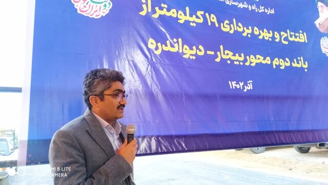 جهانگیر الیاسی، امروز (یکشنبه، پنجم آذر ماه) در آیین بهرهبرداری از محور بیجار به دیواندره در جمع خبرنگاران گفت: این مسیر به طول ۵۵ کیلومتر از جمله مسیرهای مهم استان در هدایت ترافیک استانهای شمال و مرکز کشور به سمت شهرهای مرزی بانه، مریوان و مرزهای باشماق و سیران بند است.