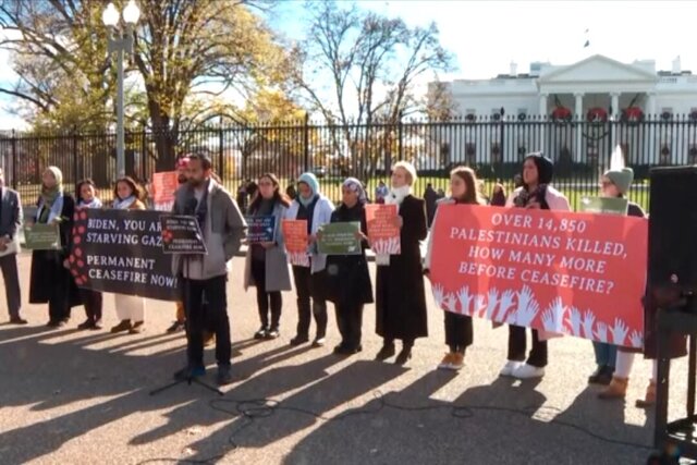 سخنرانان این گروه از حامیان فلسطین، در یک نشست خبری در مقابل کاخ سفید حضور یافته و دولت جو بایدن، رئیس جمهوری آمریکا را بابت حمایت از رژیم صهیونیستی در بمباران و حمله زمینی علیه مردم غزه محکوم کردند.