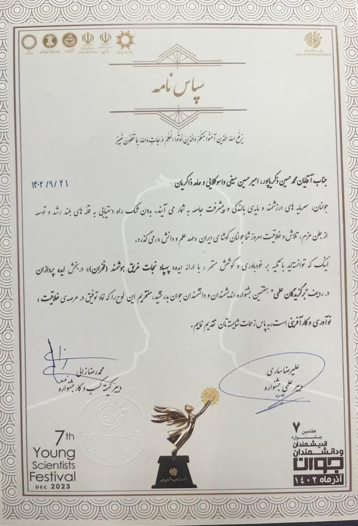 به گزارش شمال نیوز ، آقایان دکتر حامد ذاکریان ، دکتر محمد حسین ذکریاپور و مهندس امیر حسین سیفی با ارایه و طراحی و ساخت پهپاد نجات غریق هوشمند فخران برگزیده هفتمین دوره جشنواره اندیشمندان و دانشمندان شدند .