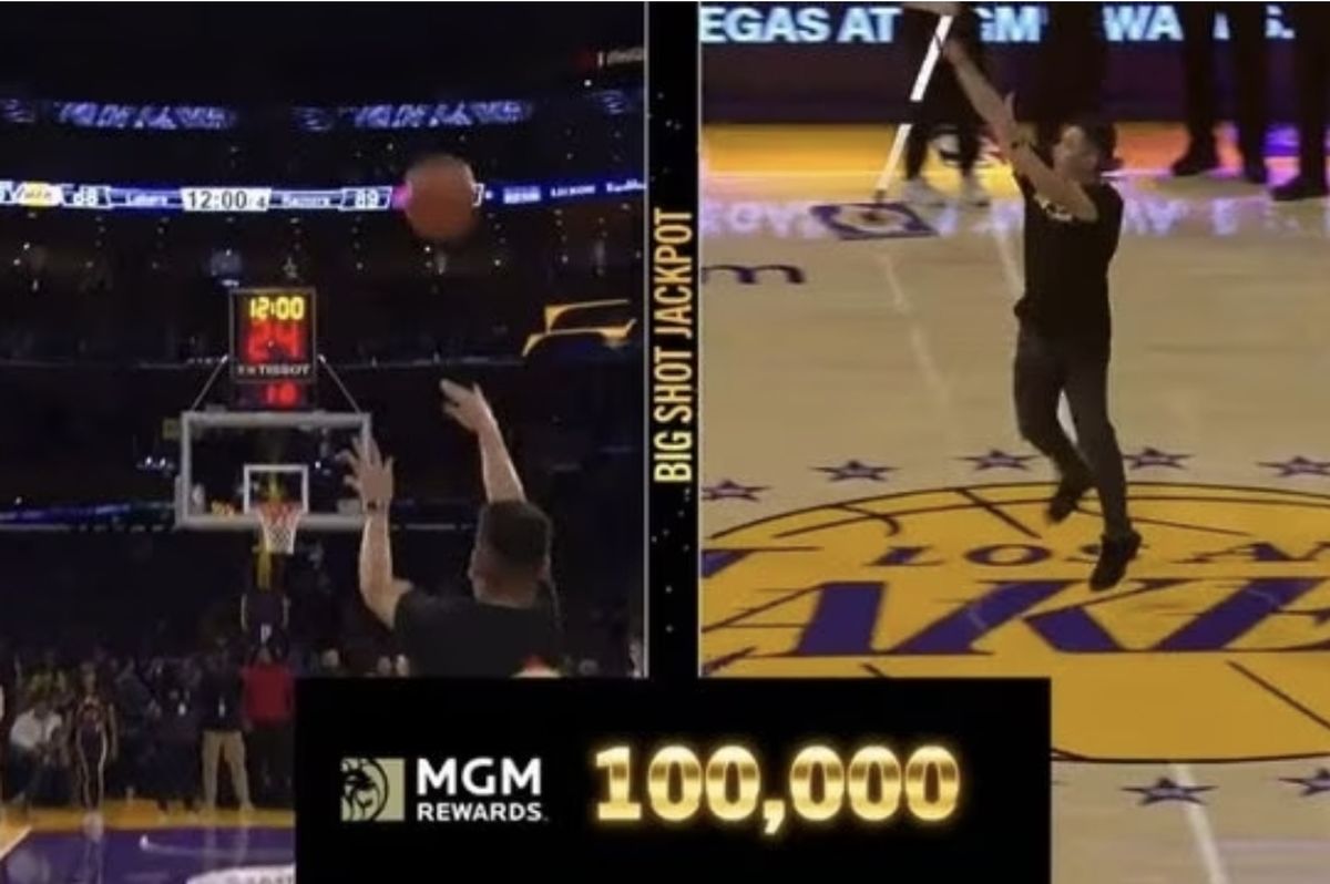یک هوادار خوش اقبال لسآنجلس لیکرز پیش از بازی این تیم با تورنتو رپترز با پرتاب از میانه زمین جایزه بزرگ ۱۰۰ هزار دلاری را به دست آورد.