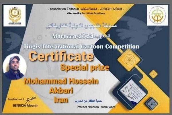 رئیس اداره فرهنگ و ارشاد اسلامی جهرم بیان کرد: در پایان این مسابقه محمدحسین اکبری کارتونیست جهرمی موفق شد جایزه ویژه اولین مسابقه بین المللی کارتون مراکش را به خود اختصاص دهد.