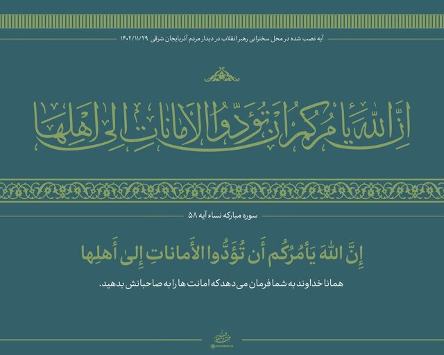 إِنَّ اللَّهَ یَأمُرُکُم أَن تُؤَدُّوا الأَماناتِ إِلیٰ أَهلِها ؛ همانا خداوند به شما فرمان میدهد که امانت ها را به صاحبانش بدهید. (سوره مبارکه نساء آیه ۵۸)