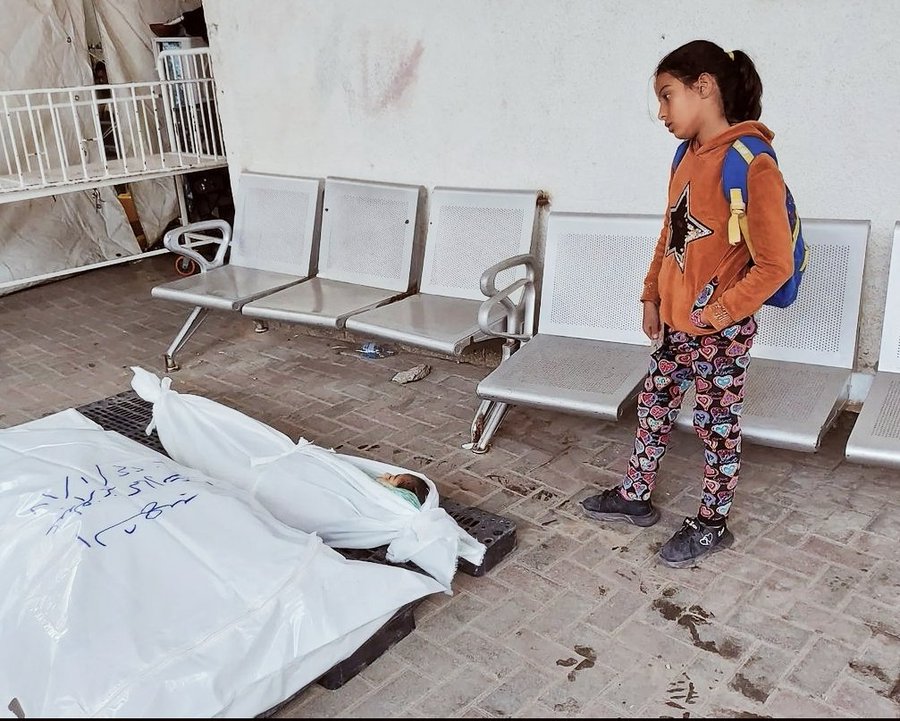 بهت و حیرت یک دختربچه اهل غزه در کنار پیکر خانواده شهیدش.