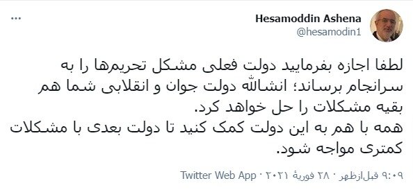 آشنا همیچنین در توییت دیگری که دقایقی قبل منتشر کرد، با تاکید بر اظهارات قبلیاش نوشت: «لطفا اجازه بفرمایید دولت فعلی مشکل تحریمها را به سرانجام برساند؛ انشالله دولت جوان و انقلابی شما هم بقیه مشکلات را حل خواهد کرد. همه با هم به این دولت کمک کنید تا دولت بعدی با مشکلات کمتری مواجه شود.»