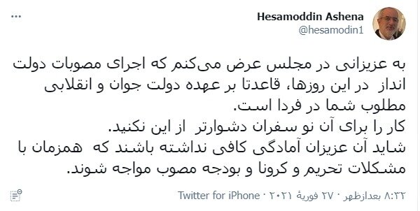 به گزارش همشهری آنلاین، حسام الدین آشنا مشاور رسانهای حسن روحانی در حساب کاربریاش در توییتر نوشت: « به عزیزانی در مجلس عرض میکنم که اجرای مصوبات دولت انداز در این روزها، قاعدتا بر عهده دولت جوان و انقلابی مطلوب شما در فردا است. کار را برای آن نو سفران دشوارتر از این نکنید شاید آن عزیزان آمادگی کافی نداشته باشند که همزمان با مشکلات تحریم و کرونا و بودجه مصوب مواجه شوند.»