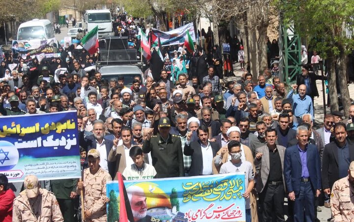 به گزارش خبرنگار مهر، مردم روزهدار و انقلابی شهر بوانات نیز امروز همگام با دیگر آزادیخواهان جهان نوای مرگ بر اسرائیل سر داده و برای آزادی قدس شریف در روز جهانی قدس راهپیمایی کردند.