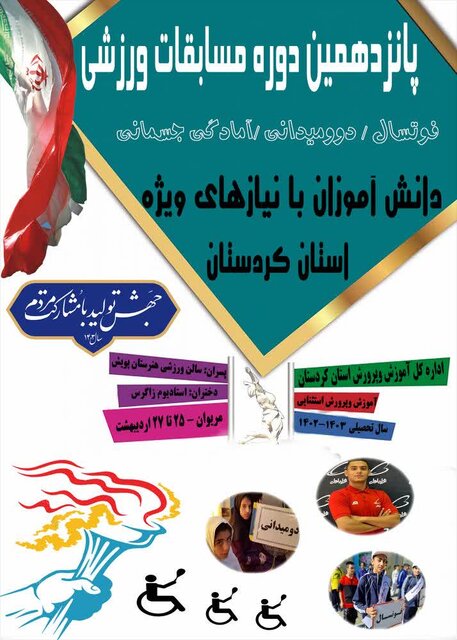 محمدی گفت: مسابقات ورزشی دانش آموزان با نیازهای ویژه استان برای دانش آموزان دارای آسیب شنوایی، نیاز ویژه ذهنی و سندروم داون در رشته های فوتسال، آمادگی جسمانی و دوومیدانی ازتاریخ ۲۵ تا ۲۷ اردیبهشت ماه جاری به میزبانی شهرستان مریوان برگزار میشود.
