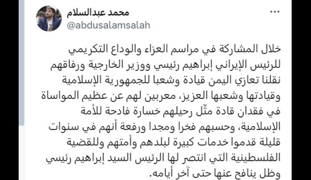 به گزارش سرویس بین الملل خبرگزاری صدا و سیما؛ محمد عبدالسلام، سخنگوی انصارالله در حساب کاربری ایکس خود نوشت: در حین شرکت در مراسم تسلیت و وداع با ابراهیم رئیسی رئیس جمهور ایران، وزیر خارجه او و همراهانشان پیام تسلیت سران و مردم یمن را به سران و مردم بزرگوار جمهوری اسلامی ایران اعلام کردیم و فقدان چنین سرانی را که رفتنشان ضایعهای بزرگ برای ملتهای مسلمان است، عمیقا تسلیت گفتیم. اینان مایه افتخار و عزت هستند. آنان فقط در چند سال خدمات بزرگی به کشور و مردمانشان و مسئله فلسطین کردند. سید ابراهیم رئیسی تا آخرین روز عمرش از مسئله فلسطین حمایت و دفاع کرد.