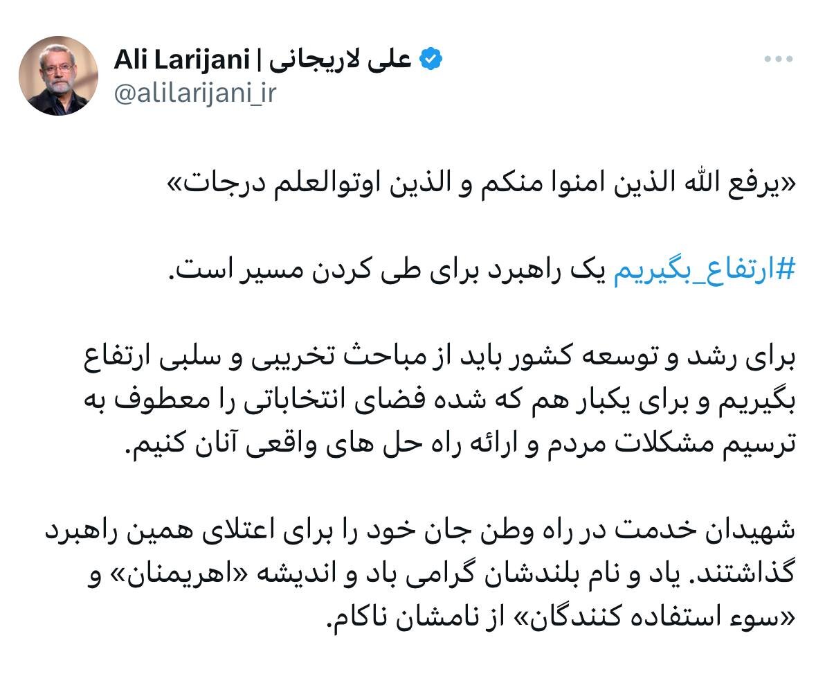 به گزارش شمال نیوز، علی لاریجانی در حساب کاربری خود در شبکه اجتماعی ایکس نوشت: