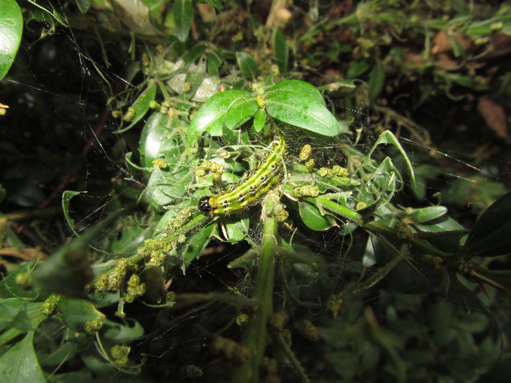 خردگی برگهای شمشاد و باقی ماندن رگبرگها، تنیدن تارهای فراوان، وجود لاروهای در حال تغذیه، وجود فضولات لاروی، بیبرگی درختان بهصورت تودهای ازجمله علائم است. خشکیدگی و سختی ظاهری درخت، خوردگی پوست شاخههای درخت، وجود زیادی شفیرهها در لابهلای برگ، تراکم شبپره در منطقه بهویژه هنگام شب، بقایای ناشی از پوستاندازی در بالههای درخت از دیگر علائم است.