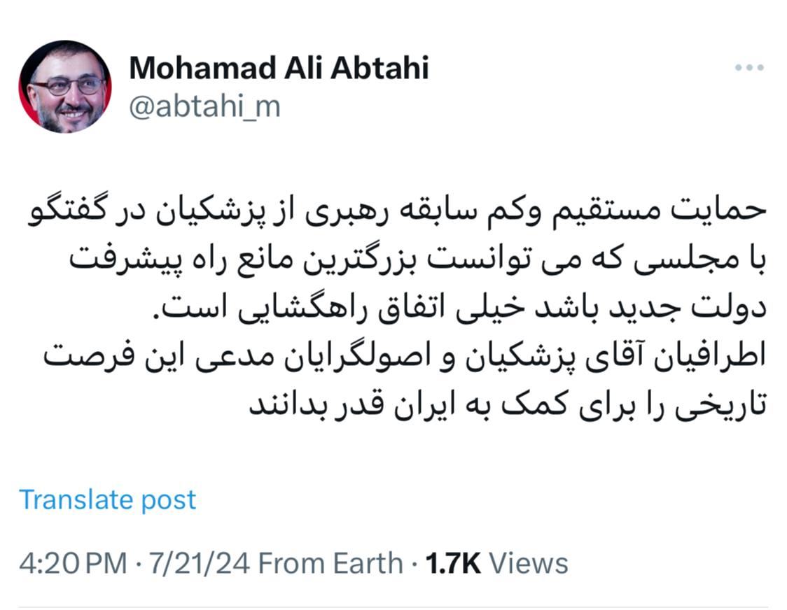 اطرافیان آقای پزشکیان و اصولگرایان مدعی این فرصت تاریخی را برای کمک به ایران قدر بدانند.