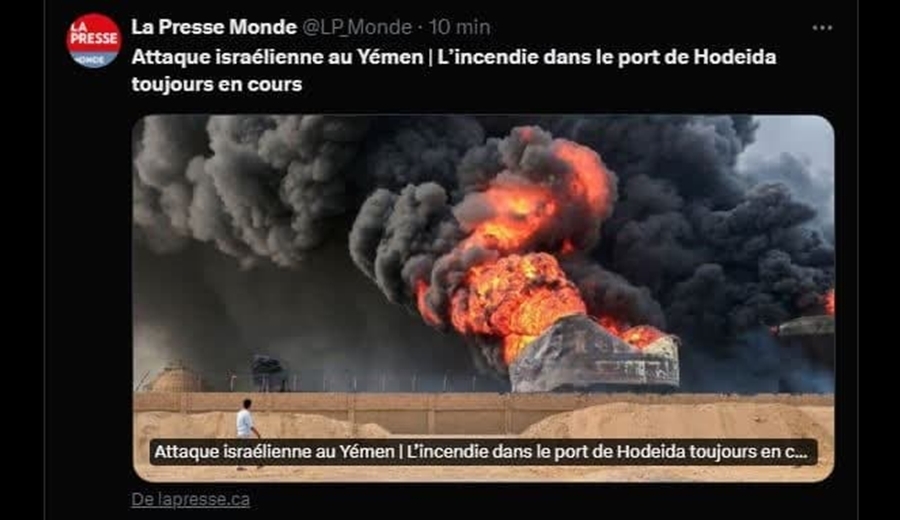 به گزارش سرویس بین الملل خبرگزاری صدا و سیما؛ پایگاه اینترنتی "لاپرس" کانادا در حساب کاربری خود در ایکس نوشت: در پی حمله اسرائیل به یمن، آتش سوزی در بندر الحدیده همچنان ادامه دارد.