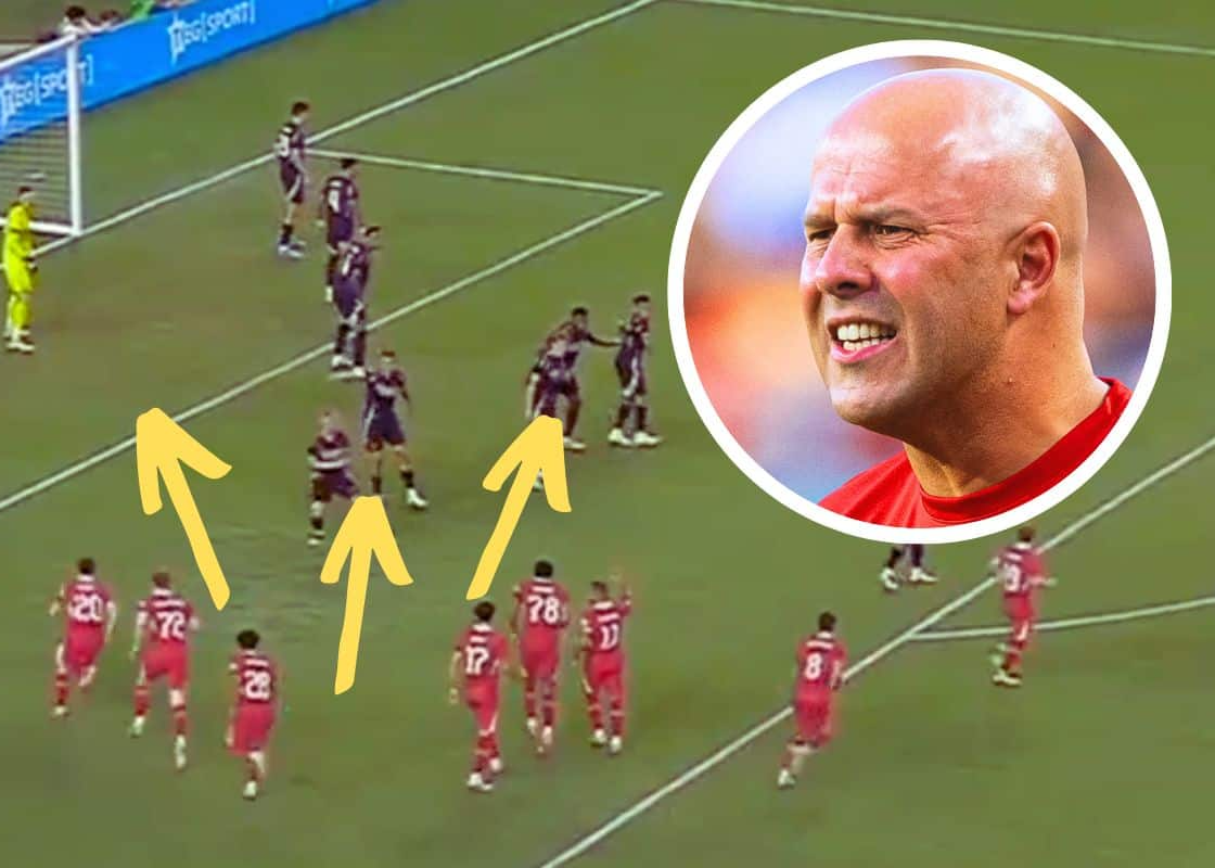جالب این بود که همه بازیکنان لیورپول به جای اینکه در میانه محوطه جریمه قرار گرفته و اجازه بدهند توسط آرسنالیها یارگیری بشوند، دورتر از بازیکنان آرسنال دور هم جمع شدند، در نزدیکی خط عمودی سمت چپ محوطه.