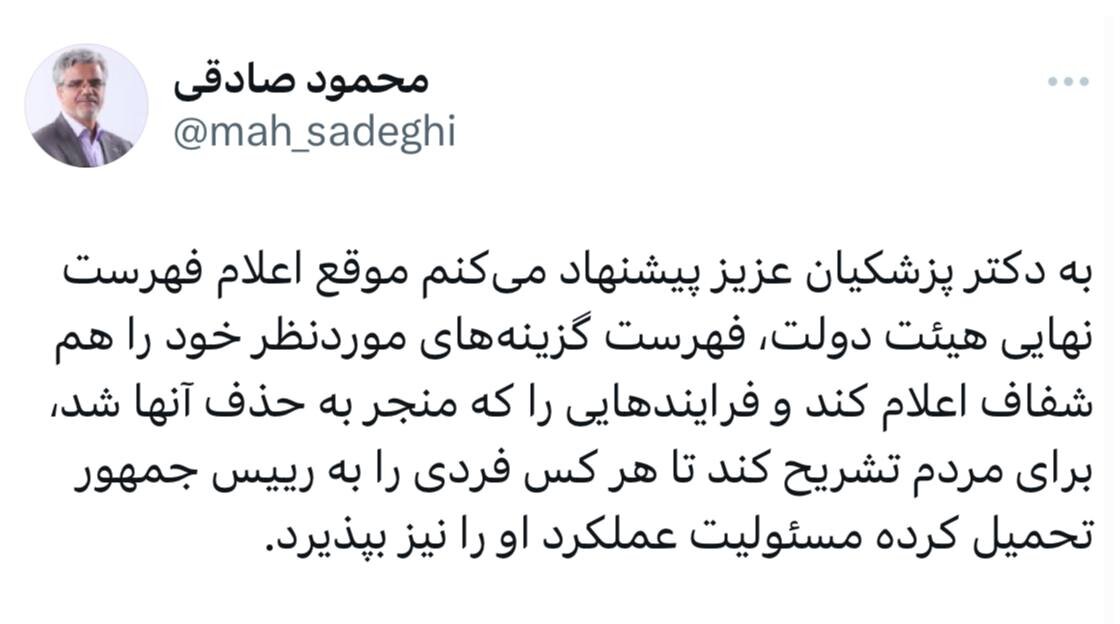 به دکتر پزشکیان عزیز پیشنهاد میکنم موقع اعلام فهرست نهایی هیئت دولت، فهرست گزینههای موردنظر خود را هم شفاف اعلام کند و فرایندهایی را که منجر به حذف آنها شد، برای مردم تشریح کند تا هر کس فردی را به رییس جمهور تحمیل کرده مسئولیت عملکرد او را نیز بپذیرد.