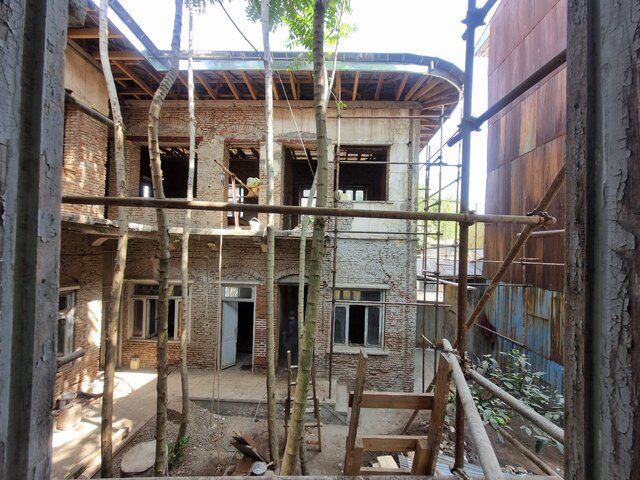 روبروی پارکینگی که از خانه تاریخی اکبر سربرآورده، تراس سیمانی خانهای که در میان داربستها گیر افتاده توجهم را جلب میکند. معلوم است که سیمان بری را از نمای خانه زدودهاند و حالا نمای آجرچینی قجری از پشت نمای سیمانی که در دوره پهلوی به بنا تحمیل شده به درآمده است. این را مهندس مهرداد منفرد میگوید که مرمت این بنای تاریخی را بر عهده گرفته است. بنایی که توسط خانواده کهنسال خریداری و قرار است به جای تخریب، مرمت و احیا شود.