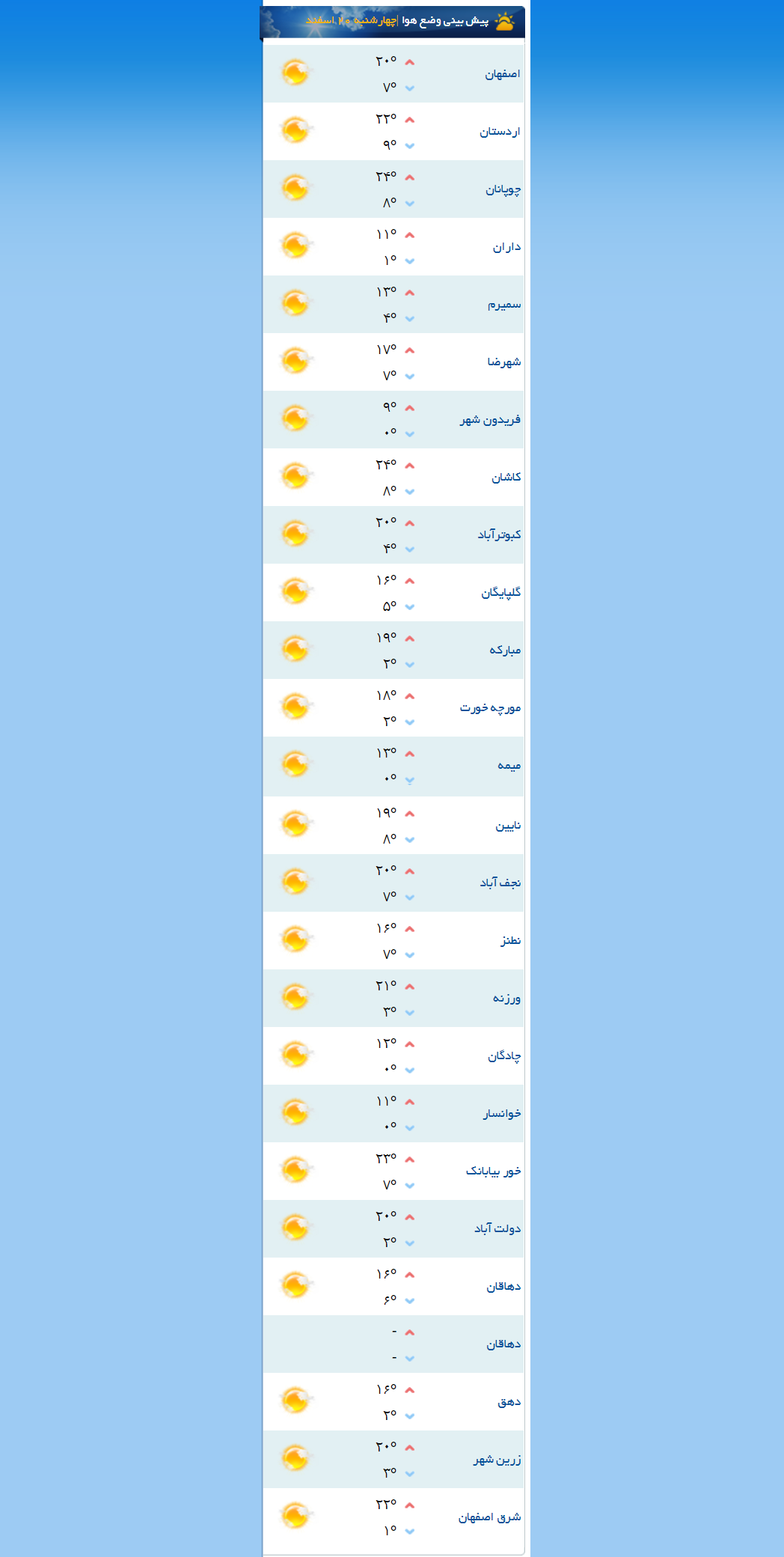 بر اساس این گزارش دمای هوا در بیشتر مناطق استان در ۲۴ ساعت آینده ۱ تا ۳ درجه کاهش خواهد داشت و هوای کلانشهر اصفهان امروز چهارشنبه، کمی ابری گاهی افزایش ابر و وزش باد به نسبت شدید تا شدید و فردا پنجشنبه، قسمتی ابری بتدریج افزایش ابر و وزش باد به نسبت شدید تا شدید و در عصر و شب بارش پراکنده پیش بینی میشود.