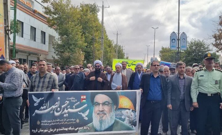 قروه_مردم شهر قروه در پی شهادت سید حسن نصرالله دبیرکل حزب الله لبنان و در محکومیت جنایات رژیم صهیونیستی راهپیمایی کردند و فریاد مرگ بر آمریکا و مرگ بر اسراییل سر دادند.
