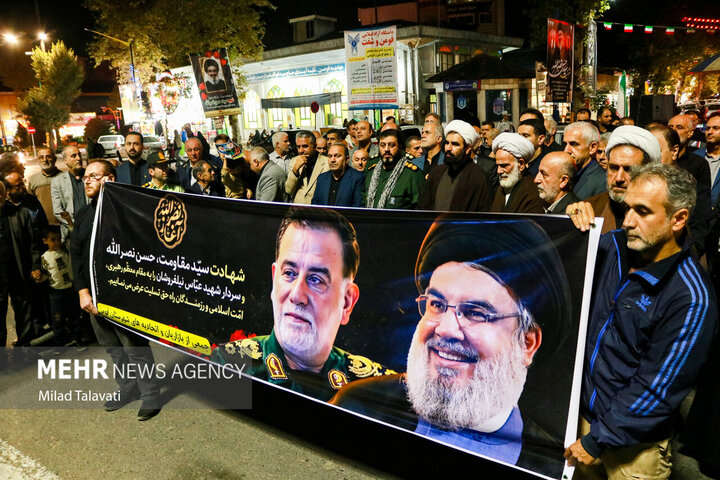 فومن- مردم فومن در پی شهادت «سید حسن نصرالله» دبیرکل حزب الله لبنان با تجمع در میدان والیعصر(عج) فومن جنایات رژیم صهیونیستی را محکوم کردند.