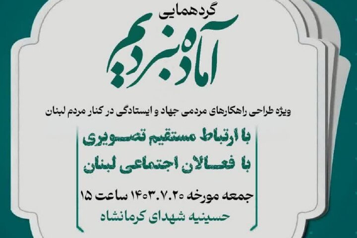 در این گردهمایی راهکارهای مردمی جهاد و ایستادگی در کنار مردم لبنان به صورت ویژه طراحی و بررسی خواهد شد.