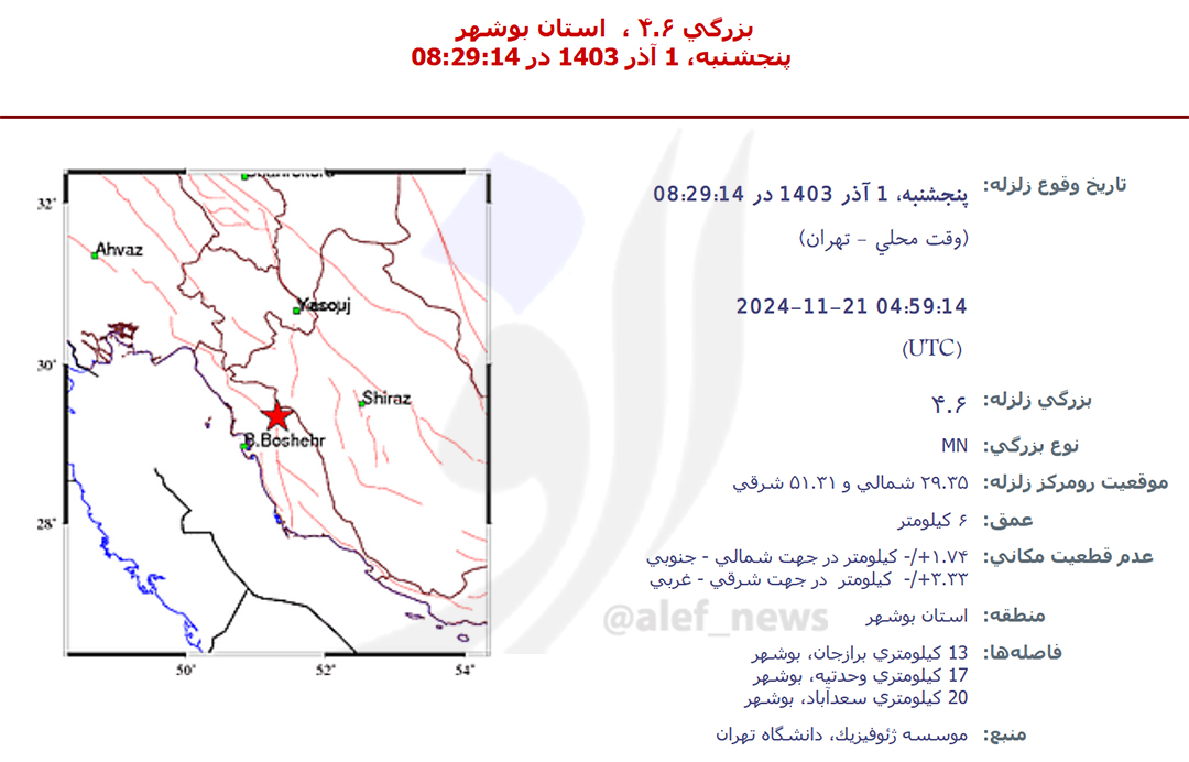 زلزلهای به بزرگی ۴.۶ ریشتر دقایقی پیش مرکز برازجان در استان بوشهر را لرزاند که سبب وحشت مردم این منطقه شد.