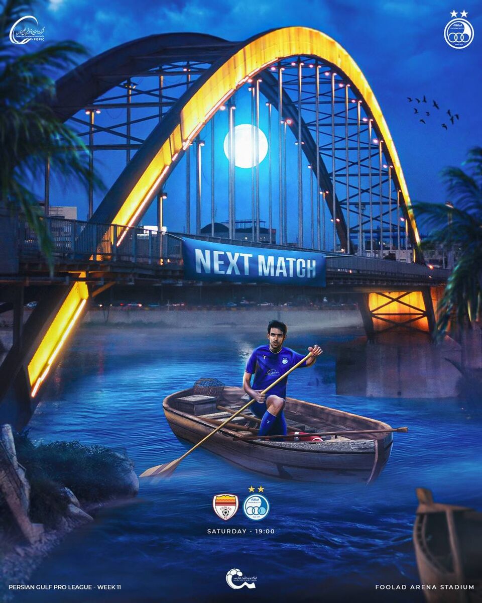 این مسابقه ساعت ۱۹ شنبه ۱۷ آذر در ورزشگاه شهدای فولاد اهواز آغاز خواهد شد. در این پوستر بازیکن خوزستانی استقلال در حال عبور از کارون زیر پل اصلی شهر اهواز است که نماد این شهر به حساب می آید.